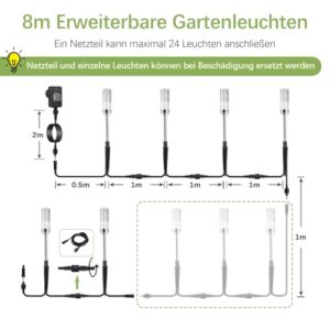 - 6 in 1 & Erweiterbare Gartenbeleuchtung: Diese Außenbeleuchtung Kombination enthält 6 Gartenleuchten (6m) und Netzteile (2m), Gesamtlänge ist 8m. Sie können auch die Anzahl der Leuchten nach Bedarf reduzieren oder erhöhen. Einfach zu entfernen und anzuschließen. Wenn Sie weitere Leuchten (Max 24) hinzufügen oder die Länge verlängern möchten, kaufen Sie bitte B0F28N1FH4 (6 Leuchten) B09WGVTJ7R (4m Kabel) B07VMRPX52(Y-Form Kabel)