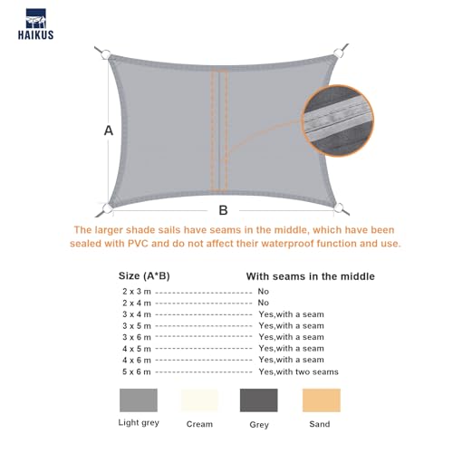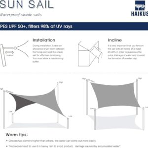 - 98% UV-Blockierung und wasserdicht -Das hochwertige HAIKUS PES Sonnensegel blockiert 98% der schädlichen UV-Strahlen (UPF 50+). Zudem garantiert das Sonnensegel eine hervorragende Wasserabdichtung durch die doppelte wasserabweisende PU-Beschichtung auf der Innenseite. Das Sonnensegel besteht aus zwei stoffteilen. Die Nähte des stoffes sind mit heißpresskleber behandelt, verhindert das eindringen von wasser durch nähte. Wasserdruckbeständigkeit: 700 mm HH