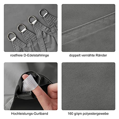 - Hohe Qualität - Das sonnensegel besteht aus 160 g/qm polyestergewebe. Es hat die eigenschaften hoher Zugfestigkeit. Alterungsbeständigkeit, Korrosionsbeständigkeit und Strahlungsbeständigkeit. Für bessere Reißfestigkeit wird an den Ecken 60cm langes, 18g dickes Band genähnt. An jeder Ecke gibt es langlebige D-Ringe aus Edelstahl 304, diese wurden für eine hervorragende Stabilität extra mehrfache quer vernäht.