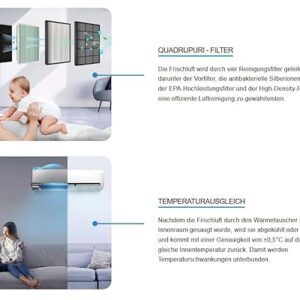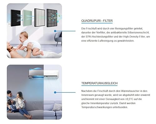 - Ein besonderes Merkmal des U-Fresh Split-Klimageräts ist die integrierte Frischluftzufuhr. Das Gerät zieht kontinuierlich frische Außenluft an und sorgt so für eine optimale Luftqualität in Ihren Räumen. Durch den Einsatz von hochwertigen Luftfiltern werden Staub, Pollen und andere Schadstoffe effektiv aus der Luft entfernt, was besonders für Allergiker von Vorteil ist.
