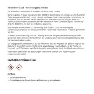 - Klimaanlagen dürfen nach der EU-Verordnung Nr. 2024/573 ausschließlich dann an Endverbraucher verkauft werden, wenn vor dem Kauf der schriftliche Nachweis erbracht wird, dass die Installation und Inbetriebnahme der Split-Klimaanlage durch einen zertifizierten Fachbetrieb erfolgen wird. Hierfür muss vorab eine Auftragsbestätigung des beauftragten Fachunternehmens vorgelegt werden. Bitte beachten Sie, dass wir ohne diesen Nachweis und die entsprechende Auftragsbestätigung keine Split-Klimaanlage an Sie verkaufen dürfen. Mit dem Kauf einer Split-Klimaanlage bestätigen Sie, dass die Installation von einem entsprechend qualifizierten Fachunternehmen durchgeführt wird.