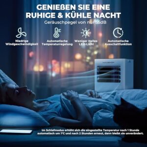 - [4-in-1 Multifunktion]Diese mobile Klimaanlage bietet nicht nur effiziente Raumkühlung, sondern kann auch als Luftentfeuchter eingesetzt werden, der täglich bis zu 25 Liter Feuchtigkeit entfernt. Zusätzlich ermöglicht der Lüftungsmodus eine Luftzirkulation. Der Schlafmodus sorgt für einen komfortablen Schlaf. Zudem gibt es eine 24-Stunden-Timer- und Kindersperrfunktion, die alle über das Bedienfeld oder die Fernbedienung einfach gesteuert werden können.