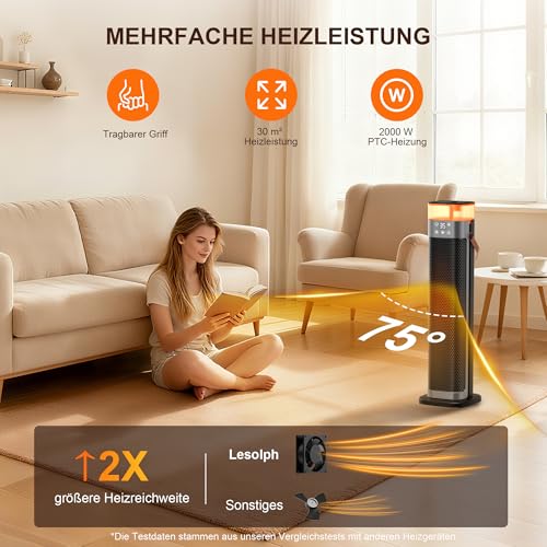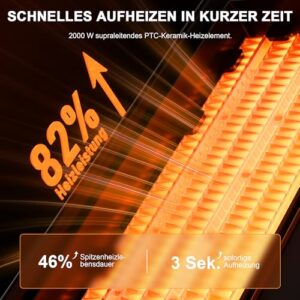 - 【Leistungsstarkes und effizientes Heizen, sofortige Wärme】Dieser energiesparende Heizlüfter von Lesolph verfügt über ein 2000W Keramik Heizelement und eine leistungsstarke Gleichstrommotor-Technologie für eine effiziente Sofortheizung in nur 3 Sekunden. Er heizt jeden Raum schnell und effektiv auf, fördert die Warmluftzirkulation und sorgt für sofortige Wärme. Im Vergleich zu herkömmlichen Heizlüftern erzielt der Lesolph Heizlüfter energiesparend eine um 82 % höhere Heizleistung und eine um 46 % längere maximale Heizlebensdauer. Dieser erstklassige Elektroheizkörper sorgt dafür, dass Sie den ganzen Winter über angenehme Wärme genießen können.
