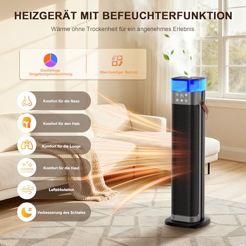 - 【Mit Umgebungsbeleuchtung und Befeuchtung für Wärme ohne Trockenheit】Stört Sie immer noch die Trockenheit und das Unbehagen, das herkömmliche Elektroheizlüfter im Winter verursachen? Dieser Elektro heizlüfter verfügt über eine Befeuchtungsfunktion, Feuchtigkeit aus seinem 350ml-Wassertank abgibt. Drei Umgebungslichter wechseln automatisch alle 10 Sekunden. Sowohl der Luftbefeuchter als auch die Umgebungsbeleuchtung können gleichzeitig mit dem Elektro Heizlüfter betrieben werden und schützen so Ihre Familie, Pflanzen und Babys vor trockener Luft. Die drei automatisch wechselnden Umgebungslichter schaffen eine einzigartig gemütliche Atmosphäre!