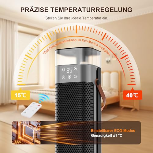 - 【Präzise Temperaturregelung, 3 Heizmodi】Diese energiesparende Elektroheizung verfügt über einen Thermosensor für eine beispiellose Präzision bei der Einstellung der Raumtemperatur. Mit einem Temperaturbereich von 15-40 °C und einer Genauigkeit von ±1 °C können Sie die Temperatur und den Modus über das digitale Bedienfeld oder die Fernbedienung sofort einstellen und so für eine präzise Heizleistung sorgen. Die energiesparende Elektroheizung bietet 3 Heizmodi: 0d Natürlicher Luftstrom, 1d ECO-Modus und 2d Leistungsheizung. Genießen Sie den Komfort von natürlicher Brise und warmer Luft während kalter Winter!