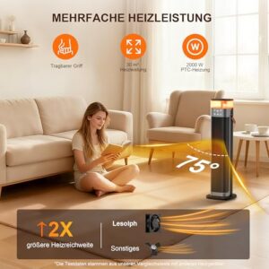- 【Gleichmäßige Wärmeverteilung mit 75°-Weitwinkel-Oszillation】Dieser 23-Zoll Elektro heizlüfter verfügt über ein großes 2000-W-Keramikheizelement.Dank der vergrößerten PTC-Oberfläche hat sich die Aufheizgeschwindigkeit des Raumheizgeräts verdoppelt, während die verbesserte Struktur den Heizbereich erweitert. In Kombination mit einer 75°-Weitwinkel-Oszillation verteilt es die Wärme effektiv und gleichmäßig im gesamten Raum. Passen Sie die Richtung des warmen Luftstroms an, um bestimmte Bereiche gezielt zu erwärmen oder einen größeren Raum abzudecken. Perfekt geeignet für große Flächen bis zu 30 Quadratmetern.