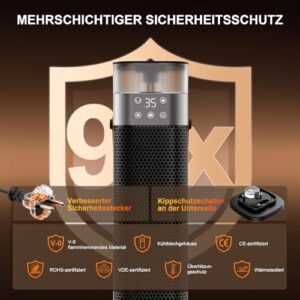 - 【Umfassender Sicherheitsschutz】Dieser heizer elektrisch sorgt mit umfassenden Sicherheitsfunktionen für wohlige Wärme im Winter. Das gesamte Gerät besteht aus flammhemmendem, umweltfreundlichem ABS-Material der Klasse V0 und verfügt über ein Gehäuse, das sich kühl anfühlt. Ein Kippschutzschalter an der Basis unterbricht automatisch die Stromzufuhr, wenn der Heizstrahler vom Boden abhebt oder kippt. Ein interner Überhitzungsschutz und ein verbesserter Sicherheitsstecker sorgen für zusätzliche Sicherheit. Alle unsere Heizgeräte verfügen über CE-, ROHS- und VDE-Zertifizierungen, die hohe Qualität und strenge Sicherheitsstandards garantieren.