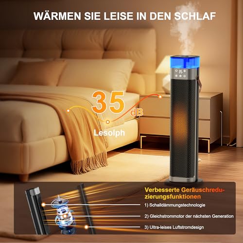- 【Leises Komfort-Erlebnis】Die energiesparende Elektroheizung verwendet einen bürstenlosen Gleichstrommotor in Kombination mit extrem leisen Luftstromflügeln, um Turbulenzen zu minimieren und eine gleichmäßigere, leisere Heizleistung von nur 35 dB zu erzielen. Genießen Sie Wärme in Ruhe für einen ungestörten Schlaf. Der auf 12 Stunden verlängerte Timer sorgt für ungestörte Nächte ohne nächtliche Einstellungen und maximiert so Komfort und Energieeffizienz.