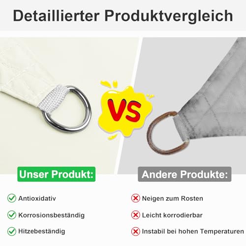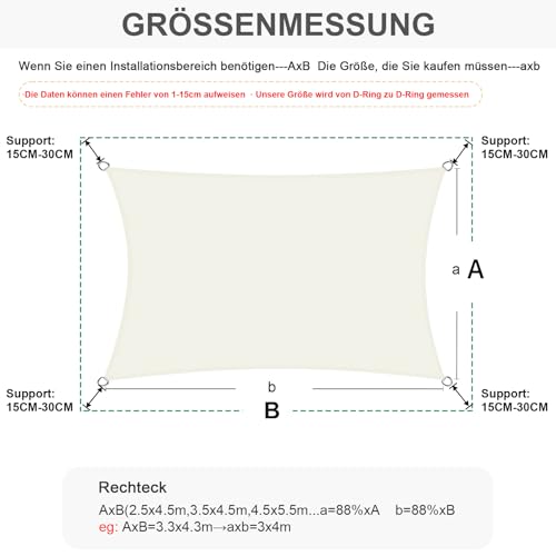 - 【Wichtiger Messhinweis für die perfekte Passform】Bitte messen Sie vor dem Kauf genau! Aufgrund des gewölbten Randdesigns ist die tatsächliche Schattenfläche leicht kleiner. Planen Sie 15-30 cm für die Befestigung ein. Handarbeit kann zu ±5 cm Abweichung führen. So vermeiden Sie Frust und garantieren die perfekte Montage.