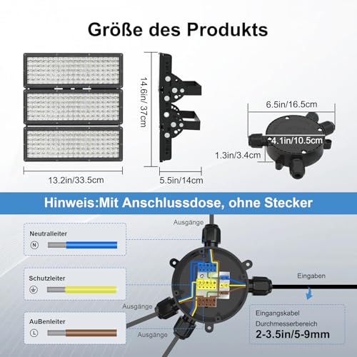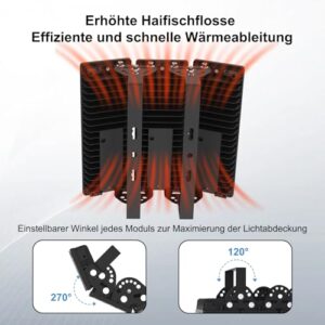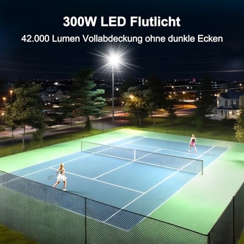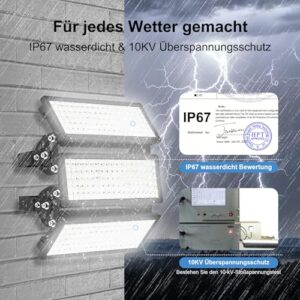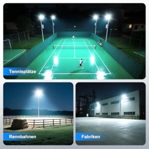 - Superhelle Beleuchtung: Dieser 230V 300W LED flutlichtstrahler bietet eine Helligkeit von bis zu 42.000 Lumen und übertrifft damit herkömmliche 4000W-Halogenlampen bei weitem. Er liefert tageslichtweißes Licht mit 6500K und eignet sich ideal zur Ausleuchtung großer Flächen (bis zu 720 m²), wie z. B. Parkplätze, Baustellen, Sportplätze oder Lagerhallen