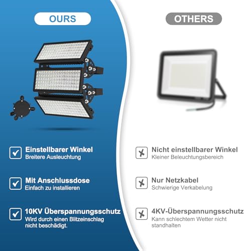 - Stabile Leistung: Der flutlicht LED außen verfügt über eine fortschrittliche PCB-Schaltung mit integriertem Spannungsregler und zweischichtigem 10KV-Überspannungsschutz. Dies bietet zusätzlichen Schutz vor Spannungsschwankungen, verhindert Geräteschäden und verlängert die Lebensdauer – ideal für den Einsatz an Orten mit instabiler Stromversorgung wie Baustellen oder landwirtschaftlichen Betrieben