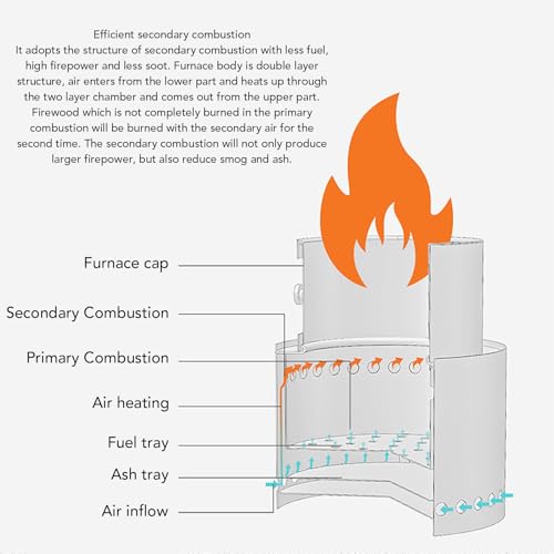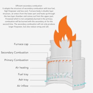- Effiziente Sekundärverbrennungsstruktur: Sie verfügt über ein innovatives Design, das die Kraftstoffeffizienz maximiert und gleichzeitig Smog und Asche minimiert.Bei einer einzigartigen Doppelschichtstruktur tritt Luft von unten ein und strömt durch eine zweite Heizkammer, bevor sie von oben ausgestoßen wird.Dadurch kann unverbranntes Brennholz mit der zugeführten Luft einer zweiten Verbrennung unterzogen werden, was zu einer höheren Wärmeabgabe und einer saubereren Verbrennung führt.