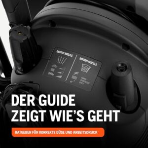 - Flexible Düsenauswahl - Im Lieferumfang sind sowohl eine variable Flachstrahl- als auch eine Rotationsdüse enthalten. So können Sie nahtlos zwischen verschiedenen Oberflächenarten und Reinigungsintensitäten wechseln.