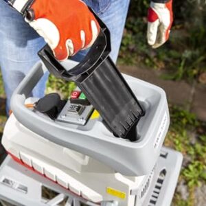 - Einzug und Walze: Geräuscharm und sicher durch rückschlagfreies Walzensystem, selbstständiger Asteinzug (max. Astdurchmesser 45 mm), Kippschalter mit Rückwärtslauf bei Ast-Blockierung, inkl. Stopfer