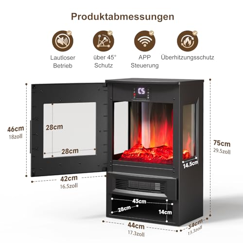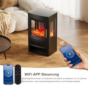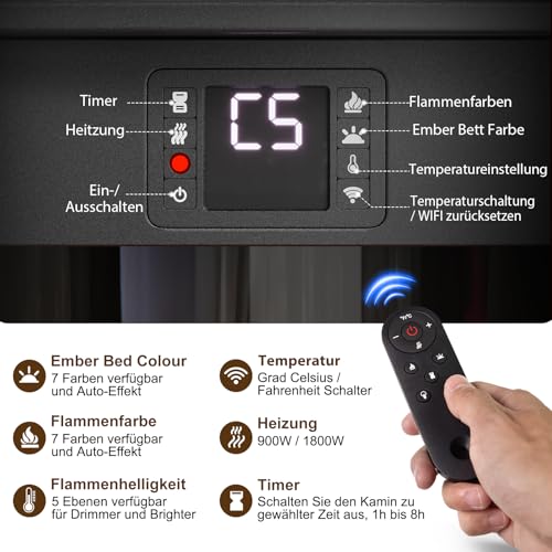 - [Steuerung mit Smart App]: Dieser Innenkamin verfügt über intelligente App-Steuerung, die es Ihnen ermöglicht, ihn jederzeit und überall zu bedienen, um Ihr Zimmer vorzuwärmen. Sie können auch Flammeneffekte, Farben von Glutbett, Helligkeitsstufe, Heizung, Timer usw. mit multifunktionaler Fernbedienung oder durch Touchscreen steuern, was maximale Bequemlichkeit und Flexibilität anbietet.