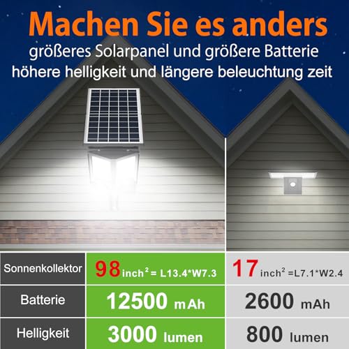 - Giant-Weitwinkel Beleuchtung: Super bright intelamp solarlampen für außen mit bewegungsmelder, Helligkeit bis zu 3000 Lumen, 240°-Weitwinkel-Beleuchtungsdesign beleuchtet einen größeren Bereich.