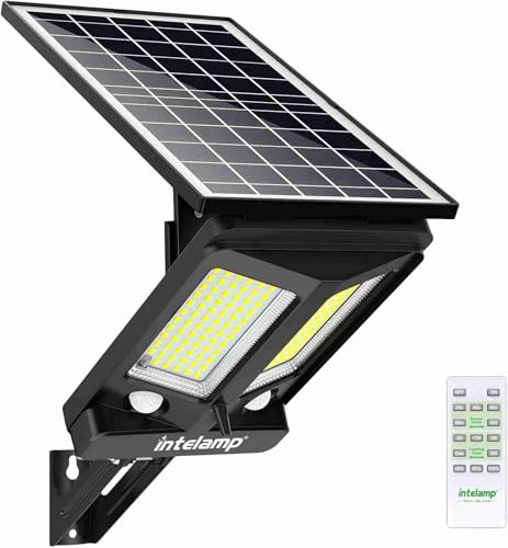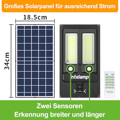 - Hohe Helligkeit und lange Leuchtdauer: intelamp solarlampe mit bewegungsmelder Mit einem Solarpanel mit hoher Umwandlungsrate von monokristallines Silizium-Solarpanel und einem sicheren 12500-mAh-Lithiumeisenphosphat Akku kann die intelamp Solarlampen für Außen bei starker Sonneneinstrahlung innerhalb von 5 Stunden vollständig aufgeladen werden, um ausreichend Strom bereitzustellen.Helligkeit von über 3000 LM(Helligkeit entspricht einer 200-W-Glühlampe).