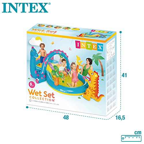 - Der aufblasbare Vinylpool verfügt über eine Mini-Wasserrutsche mit gepolsterter Landematte, einen Bogen mit Sprinkler, der an einen Gartenschlauch angeschlossen werden kann, sechs bunte Fun-Ballz-Bälle aus Kunststoff, Ringe zum Spielen von Dinosaurierschlägen und einen Ablassstopfen.