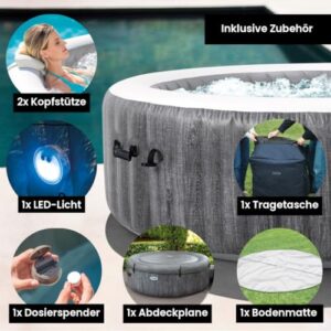 - KOMPLETTPAKET - Der Whirlpool wird mit einem umfangreichen Zubehörpaket geliefert, das Ihnen sofortigen Start-Spaß ermöglicht. Im Lieferumfang enthalten sind zwei Filterkartuschen, eine isolierende Abdeckung mit Sicherheitsverschlüssen, eine schützende Bodenmatte und eine praktische Tragetasche/Aufbewahrugnstasche