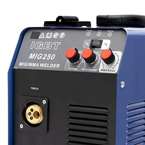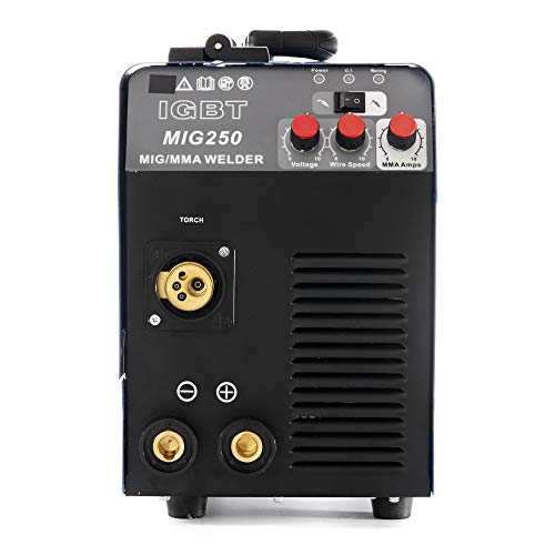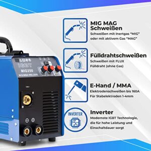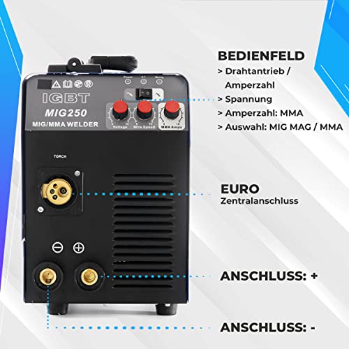 - ▲ FUNKTIONEN: Das Schweißgerät MIG 250A ermöglicht Ihnen MIG MAG Schweißen und Fülldrahtschweißen (mit oder ohne Gas) sowie MMA E-Hand Schweißen