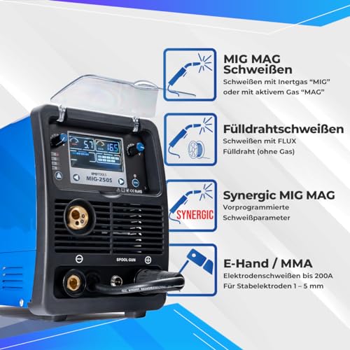 - ▲ FUNKTIONEN: Das schutzgas Schweißgerät MIG 250SYN ermöglicht Ihnen MIG MAG Schweißen und Fülldrahtschweißen (mit oder ohne Gas) sowie MMA E-Hand Schweißen und WIG Schweißem (LIFT TIG)