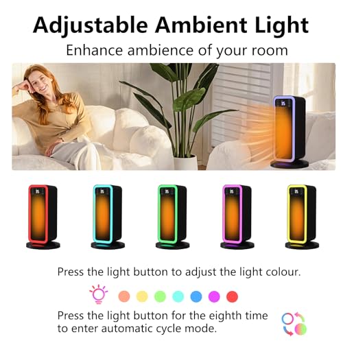 - RGB-Umgebungsbeleuchtung: Der Heizkörper ist von Neon-Umgebungsbeleuchtung umgeben. Sie können je nach Umgebung verschiedene Farben und Helligkeiten der Beleuchtung verwenden oder die Lichtfarben zyklisch wechseln lassen. Heizen Sie Ihren Raum auf und schaffen Sie gleichzeitig eine stimmungsvolle Atmosphäre.