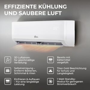- ENERGIEEFFIZIENT: Die Split Klimaanlage passt sich dank DC-Full Inverter stufenlos an, spart bis zu 50% Energie und erreicht A++ (Kühlen) & A+ (Heizen). TitanGold-Beschichtung erhöht die Langlebigkeit.