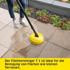 - Inklusive Home Kit: Mit dem Flächenreiniger T 1 und dem Reinigungsmittel "Stein- und Fassadenreiniger" können größere Oberflächen wie Wege oder Terrassen bequem gereinigt werden
