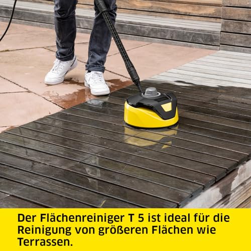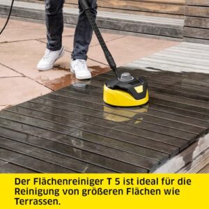 - Inklusive Home Kit: Mit dem Flächenreiniger T 5 und dem Reinigungsmittel "Patio & Deck" können größere Oberflächen wie Gartenwege oder Terrassen gereinigt werden