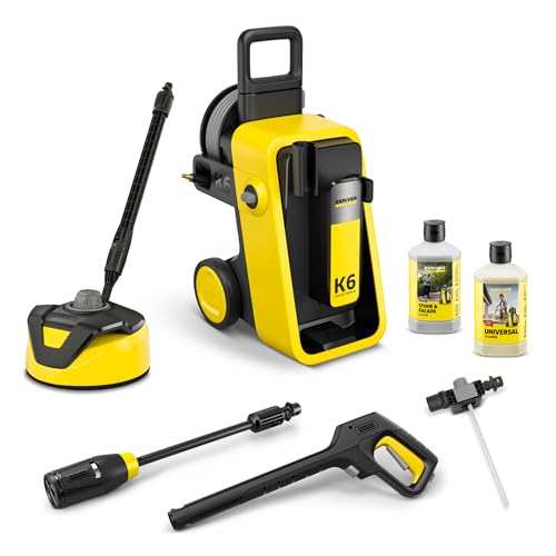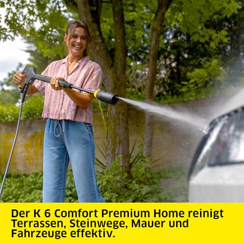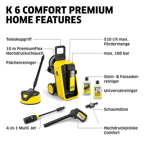 - Lieferumfang: Kärcher Hochdruckreiniger K 6 Comfort Premium Home, Hochdruckpistole mit COMFORT!Hold, 4-in-1 Multi Jet, Hochdruckschlauch (10 m), T 5 Flächenreiniger, Universalreiniger RM 626 (1 l), Stein- und Fassadenreiniger RM 611 (1 l)