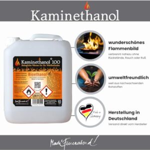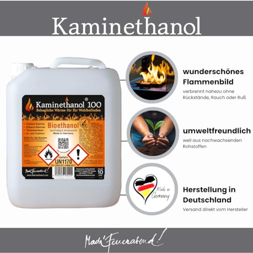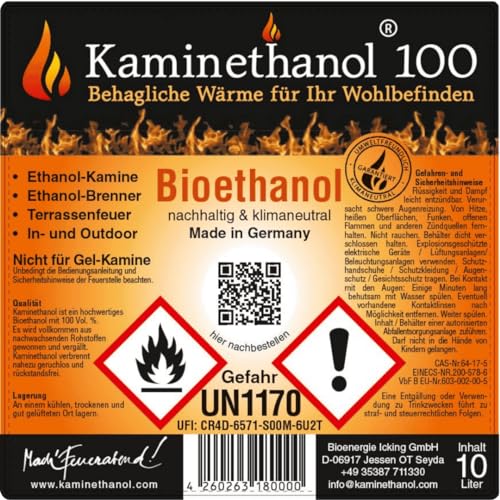 Kaminethanol Icking 120 Liter Bioethanol 100% (12 x 10 L) Premium Qualität – direkt vom Hersteller für Ethanol Kamine, Alkohol-Brenner, Terrasenfeuer, Raumfeuer und Gartenfackeln