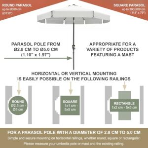 - Fixierung mit Doppelbügel & Bügelschutz: Zwei stabile Bügel mit integrierten Schutzkappen fixieren den Schirmstock sicher – passend für Durchmesser von 2,2 bis 5 cm. Geeignet für runde und rechteckige Schirme bis Ø 350 cm bzw. 300 × 200 cm.
