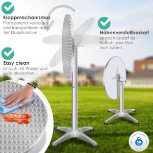 - 𝐓𝐄𝐂𝐇𝐍𝐈𝐒𝐂𝐇𝐄 𝐃𝐀𝐓𝐄𝐍: Dieser vielseitige Steh- und Bistrotisch lässt sich flexibel in zwei Höhen nutzen – als Stehtisch mit 115 cm oder als Bistrotisch mit 70 cm. Das robuste Standrohr mit 6 cm Durchmesser sorgt für Stabilität, während die hochwertigen Materialien aus Aluminium, Edelstahl und MDF für eine elegante Optik und Langlebigkeit stehen. Zusätzlich wird ein passendes Cover mitgeliefert, das den Tisch vor Witterungseinflüssen schützt.