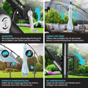 - 𝐊𝐔𝐑𝐁𝐄𝐋𝐒𝐘𝐒𝐓𝐄𝐌: Mit dem integrierten Kurbelsystem können Sie den Schirm bequem mit der leichtläufigen Handwinde öffnen und schließen. So haben Sie in Sekunden Ihren Sonnenschirm gespannt und können den Sommer genießen - Kurbeln statt schwer heben.