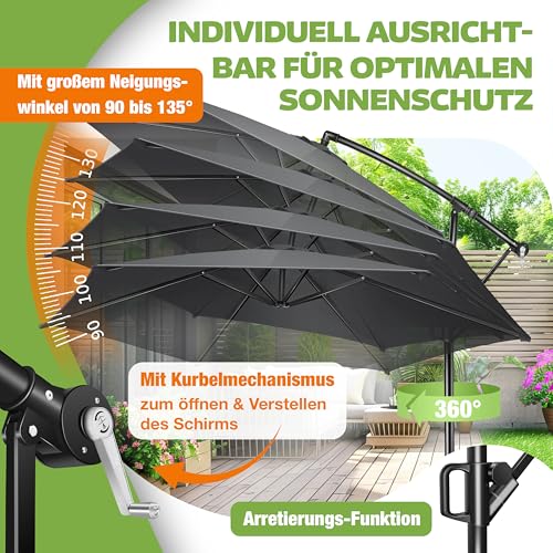 - 𝐀𝐍𝐏𝐀𝐒𝐒𝐁𝐀𝐑𝐄𝐑 𝐍𝐄𝐈𝐆𝐔𝐍𝐆𝐒𝐖𝐈𝐍𝐊𝐄𝐋: In verschiedene Neigungswinkel lässt sich der Gartenschirm stufenlos mit dem Arretierungshebel einstellen. Einfach den Hebel öffnen, den gewünschten Winkel einstellen und wieder schließen. So lässt sich der Schirm individuell nach dem Stand der Sonne anpassen. Dank der geneigten Aufhängung ist dieser Gartenschirm freischwebend und kann trotz festen Ständers um 360° gedreht werden.