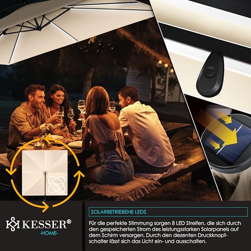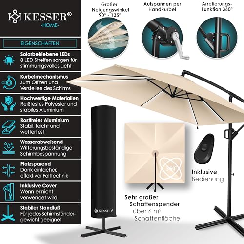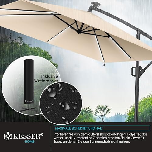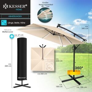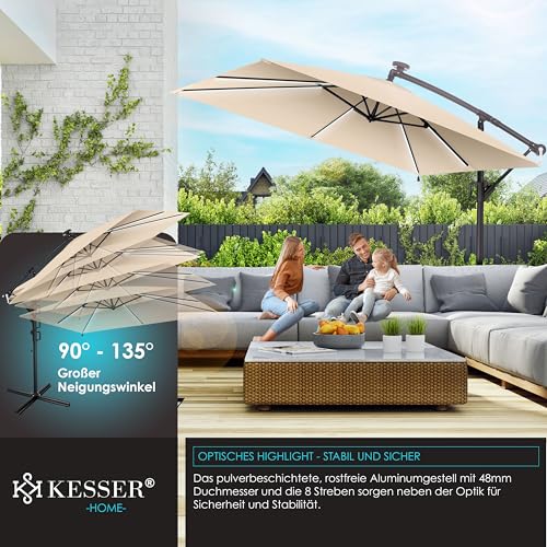 - 𝐈𝐃𝐄𝐀𝐋𝐄𝐑 𝐒𝐎𝐍𝐍𝐄𝐍𝐒𝐂𝐇𝐔𝐓𝐙: Unser Sonnenschirm aus dem Hause KESSER ist ein hochwertiges und robustes Produkt, das für den Einsatz im Freien konzipiert wurde. Mit einer großzügigen Schattenfläche von über 6m² bietet der Schattenspender viel Platz und Schutz für Sie und Ihre Gäste. Ob auf der Terrasse, im Garten oder auf dem Balkon - der Ampelschirm sorgt für ein angenehmes Ambiente und schützt vor schädlicher Sonneneinstrahlung und schlechtem Wetter.