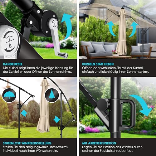 - 𝐄𝐈𝐍𝐅𝐀𝐂𝐇 𝐕𝐄𝐑𝐒𝐓𝐄𝐋𝐋𝐄𝐍: Ein Herzstück des Sonnenschirms ist der praktische Kurbelmechanismus, mit dem Sie den Schirm einfach öffnen und verstellen können. So können Sie den Marktschirm schnell und unkompliziert an Ihre Bedürfnisse anpassen. Auch die hochwertigen Materialien des Gartenschirmes tragen zu seiner Funktionalität bei. Das reißfeste Polyester der Schirmbespannung sowie das stabile Aluminiumgestell sind äußerst langlebig und widerstandsfähig.