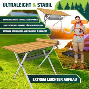 - 𝐒𝐓𝐀𝐁𝐈𝐋 𝐔𝐍𝐃 𝐁𝐄𝐋𝐀𝐒𝐓𝐁𝐀𝐑: Verstauen Sie beispielsweise Obst und Gemüse in der praktischen Netztasche, welche sich direkt unter der Tischplatte befindet. Die Tasche können Sie je nach Belieben ein- oder aushaken und bietet genügend Stauraum für kleine Gegenstände. Dank der robusten und höhenverstellbaren Tischplatte mit stabilem Gestell, können Sie den Tisch mit einem Gewicht bis zu 100kg belasten. Die Tischplatte lässt sich nach dem Gebrauch problemlos einrollen.