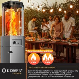 - 🔥 𝐒𝐀𝐔𝐁𝐄𝐑𝐄 𝐖Ä𝐑𝐌𝐄 𝐎𝐇𝐍𝐄 𝐑𝐔𝐒𝐒 & 𝐑𝐀𝐔𝐂𝐇: Genießen Sie wohlige Wärme ohne Ruß, Rauch oder unangenehme Gerüche! Der Terrassen-Gasheizer überzeugt mit einer präzisen Verbrennung und einer wählbaren Heizleistung von 4 kW oder 8 kW. So können Sie die gewünschte Temperatur einfach und sicher einstellen. Die angenehme Strahlungswärme ist je nach Position und Wetterbedingungen im Umkreis von 20 bis 120 cm spürbar und sorgt für sofortige Behaglichkeit.