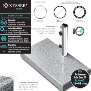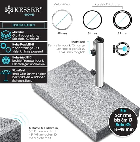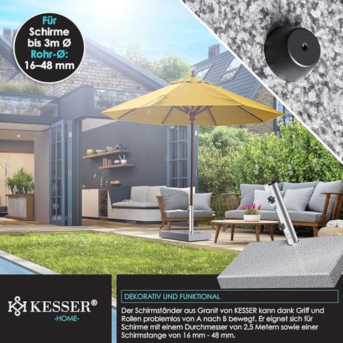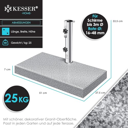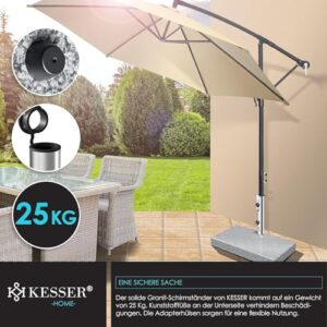 - 𝐑𝐎𝐁𝐔𝐒𝐓 𝐔𝐍𝐃 𝐒𝐓𝐀𝐍𝐃𝐅𝐄𝐒𝐓: Der solide Granit-Schirmständer von KESSER garantiert Ihnen einen soliden Stand dank des hohen Gewichts, dadurch ist das umkippen bei Windböen ausgeschlossen. Dank unserer zwei unterschiedlichen Farbausführungen finden Sie den garantiert passenden Ampelschirmständer für Ihren Garten. Dieser passt sich hervorragend Ihrem Garten an und ist dadurch ein optisches Highlight bei Ihrer nächsten Gartenparty mit Freunden oder der Familie.