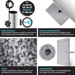 - 𝐅𝐋𝐄𝐗𝐈𝐁𝐋𝐄𝐑 𝐀𝐃𝐀𝐏𝐓𝐄𝐑: Zwei im Lieferumfang enthaltene Adapter für 4,8cm und 3,8cm Schirmstock-Durchmesser sowie ein Feststellrad sorgen bei jedem Sonnenschirm für einen stabilen Halt. Das Schirmloch ermöglicht eine geringe Wandnähe, die zum Beispiel ideal für Ampelschirme ist.