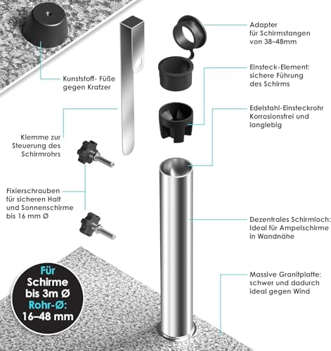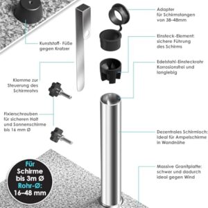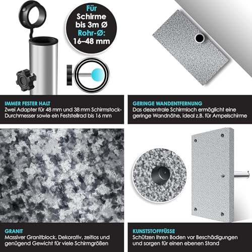- 𝐖𝐈𝐓𝐓𝐄𝐑𝐔𝐍𝐆𝐒𝐁𝐄𝐒𝐓Ä𝐍𝐃𝐈𝐆: Die Sonnenschirmhalterung aus einem robusten Granitblock ist wasserabweisend, UV- und witterungsbeständig - neben dem dekorativen und zeitlosen Design ist der Sockel dank dem hohen Gewicht für viele unterschiedliche Schirmgrößen geeignet. Die hochwertigen und stabilen Kunststofffüße schützen Ihren Boden vor Beschädigungen und sorgen für einen ebenen Stand auf jedem Untergrund.
