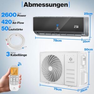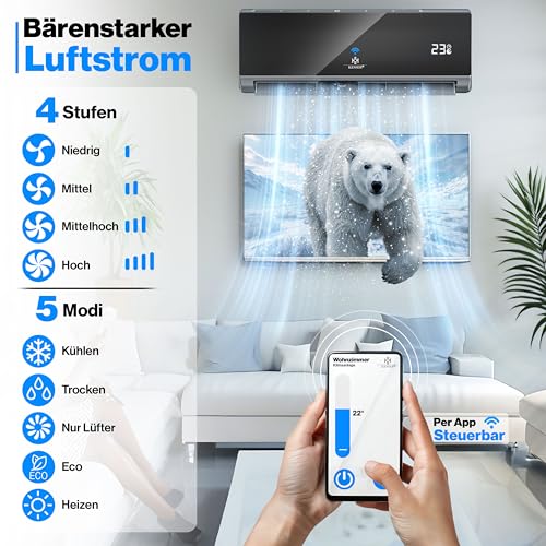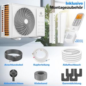 - 𝐊𝐎𝐌𝐏𝐋𝐄𝐓𝐓-𝐒𝐄𝐓: Kabelgebundener Luftkühler als Komplett-Set (WiFi-Ready, WiFi-Modul optional): ECO Smart Innen- und Außen Einheit mit Golden-Fin Beschichtung. Vorgefüllt mit modernstem Kältemittel - inklusive 3m Kupferleitungen + Kabel sowie Wandhalter mit Montagematerial. Eine Fernbedienung mit beleuchtetem LCD Display, Dichtmasse für den Wanddurchgang, Isolierband, Drainageschlauch sowie Strom-Verbindungskabel zwischen Inneneinheit und Außeneinheit runden das Gesamtpaket ab.