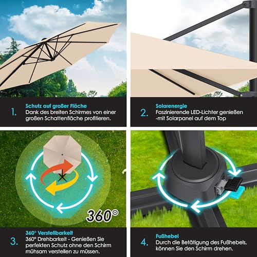 - 𝐅𝐋𝐄𝐗𝐈𝐁𝐄𝐋 𝐔𝐍𝐃 𝐑𝐎𝐁𝐔𝐒𝐓: Im Gegensatz zu herkömmlichen Gartenschirmen ist unser Terrassenschirm mit einer 360° Verstellbarkeit ausgestattet. Genießen Sie dabei perfekten Schutz ohne dabei den Schirm mühsam jedesmal aufs neue verstellen zu müssen. Über einen integrierten Fußhebel können Sie den Schirm ganz einfach und unkompliziert drehen. Einfach den Hebel betätigen und den Schirm je nach Sonneneinfall ausrichten.