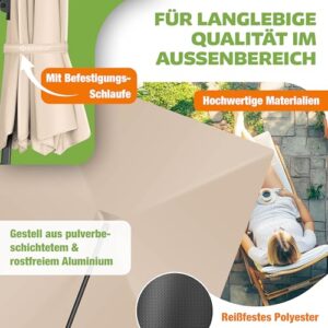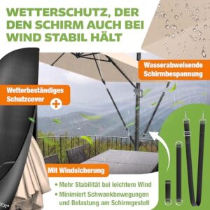 - 𝐇𝐎𝐂𝐇𝐖𝐄𝐑𝐓𝐈𝐆𝐄𝐒 𝐌𝐀𝐓𝐄𝐑𝐈𝐀𝐋: Profitieren Sie von dem äußerst strapazierfähigem Polyester, dass wetter- und UV-resistent ist. Zusätzlich erhalten Sie zwei mitgelieferte Windschutzseile, die bei starkem Wind für eine maximale Sicherheit sorgen. Außerdem ist in unserem Lieferumfang ein Cover vorhanden, mit dem können Sie den Schirm einpacken und vor äußeren Einflüssen schützen, wenn dieser mal nicht gebraucht wird.