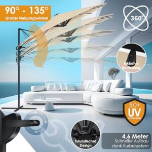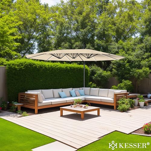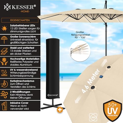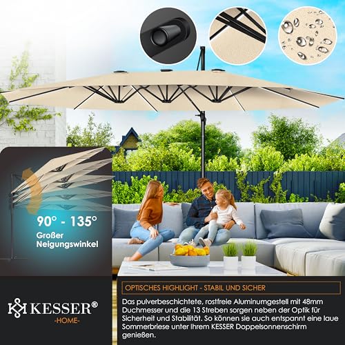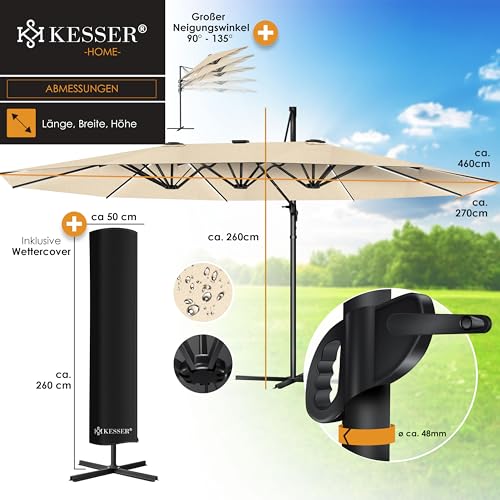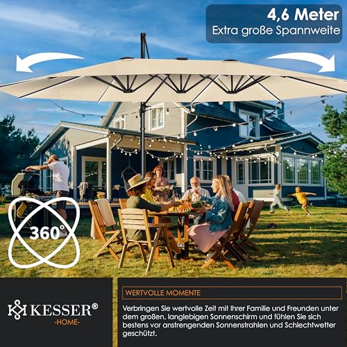 - Einfach zu bedienen: Der Doppel-Sonnenschirm von KESSER bietet mit seiner beeindruckenden Spannweite von 4,6 Metern Breite und 2,7 m Tiefe großen Schutz vor den intensiven Sonnenstrahlen, damit Sie und Ihre Familie im Freien entspannen können. Len, ohne die Hitze ausgesetzt zu sein.