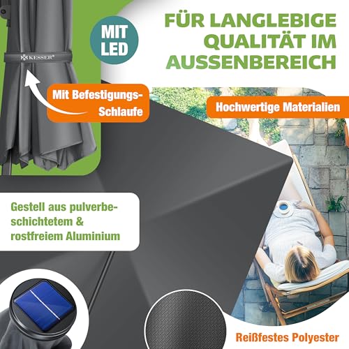 - 𝐒𝐓𝐈𝐋𝐕𝐎𝐋𝐋: Genießen Sie wertvolle Momente mit Ihren Liebsten unter dem stabilen und langlebigen Sonnenschirm von KESSER. Sei es bei einem Grillabend mit Freunden oder beim Frühstück mit der Familie auf der Terrasse, der eingebaute Neigungswinkel bietet Ihnen einen optimalen Schutz gegenüber starker Sonnenbestrahlung oder bei schlechtem Wetter. Auch die stilvolle Optik und die unterschiedlichen Farbvariationen macht Ihren Sonnenschutz zu einem echten Blickfang.