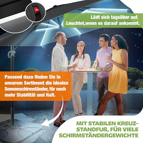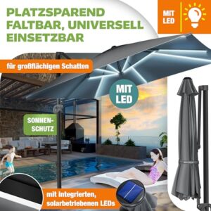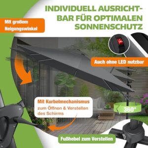 - 𝐅𝐋𝐄𝐗𝐈𝐁𝐄𝐋 𝐔𝐍𝐃 𝐑𝐎𝐁𝐔𝐒𝐓: Im Gegensatz zu herkömmlichen Gartenschirmen ist unser Terrassenschirm mit einer 360Ḟ Verstellbarkeit ausgestattet. Genießen Sie dabei perfekten Schutz ohne dabei den Schirm mühsam jedesmal aufs neue verstellen zu müssen. Über einen integrierten Fußhebel können Sie den Schirm ganz einfach und unkompliziert drehen. Einfach den Hebel betätigen und den Schirm je nach Sonneneinfall ausrichten.