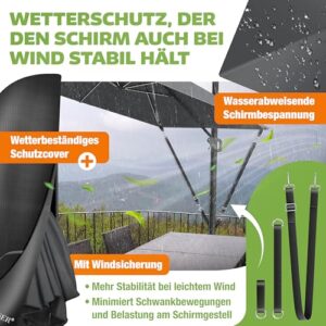 - 𝐇𝐎𝐂𝐇𝐖𝐄𝐑𝐓𝐈𝐆𝐄𝐒 𝐌𝐀𝐓𝐄𝐑𝐈𝐀𝐋: Profitieren Sie von dem äußerst strapazierfähigem Polyester, dass wetter- und UV-resistent ist. Zusätzlich erhalten Sie zwei mitgelieferte Windschutzseile, die bei starkem Wind für eine maximale Sicherheit sorgen. Außerdem ist in unserem Lieferumfang ein Cover vorhanden, mit dem können Sie den Schirm einpacken und vor äußeren Einflüssen schützen, wenn dieser mal nicht gebraucht wird.