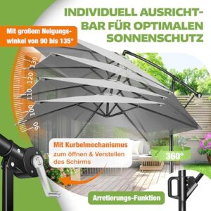 - 𝐀𝐍𝐏𝐀𝐒𝐒𝐁𝐀𝐑𝐄𝐑 𝐍𝐄𝐈𝐆𝐔𝐍𝐆𝐒𝐖𝐈𝐍𝐊𝐄𝐋: In verschiedene Neigungswinkel lässt sich der Gartenschirm stufenlos mit dem Arretierungshebel einstellen. Einfach den Hebel öffnen, den gewünschten Winkel einstellen und wieder schließen. So lässt sich der Schirm individuell nach dem Stand der Sonne anpassen. Dank der geneigten Aufhängung ist dieser Gartenschirm freischwebend und kann trotz festen Ständers um 360° gedreht werden.
